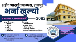 Shahid Adarsh Campus was established in 2059 BS with the motto of equitable quality education for poor and marginalized rural local people. The establishment of the campus is for running education stream under TU affiliation to fulfil the required modern skilled man powers oriented to teaching and learning. The campus has been able to prepare so skilled man powers that they have been able the fulfil the educational needs I all over Nepal. The dedication of the campus towards the educations sectors has been proved fruitful so far.