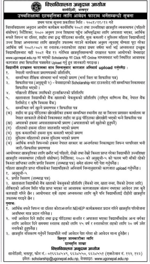 विश्वविद्यालय अनुदान आयोगले प्रदान गर्ने उच्चशिक्षाको लागि छात्रवृत्ति सम्बन्धी फाराम भर्ने सूचना
