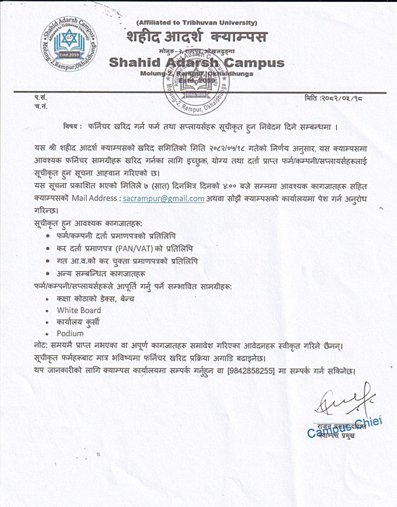 क्याम्पसमा प्रयाेगहुने फर्निचर खरिदका लागि फर्म तथा सप्लायर्सहरु सूचीकृत हुन निवेदन दिने सम्बन्धी सूचना ।